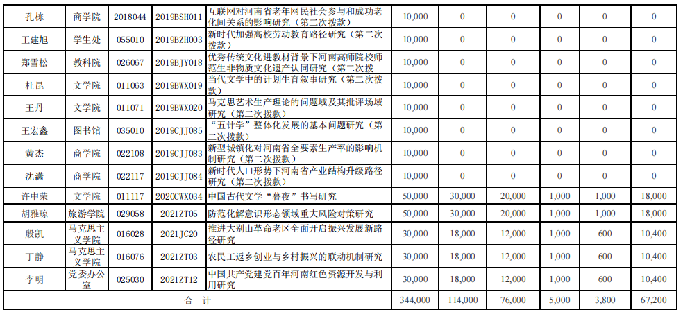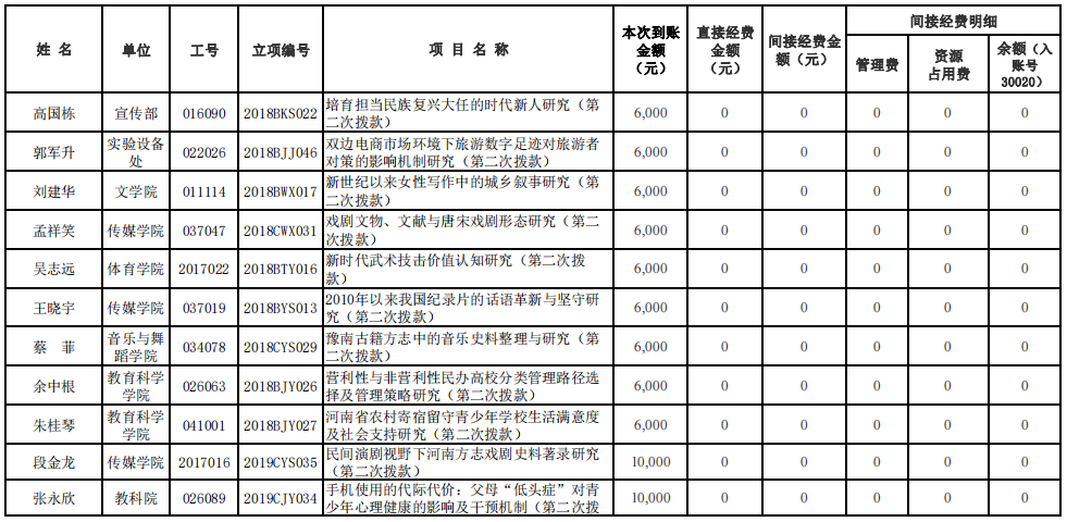 近期,高国栋、郭军升、刘建华等教师获批的河南省社科规划项目部分经费已到账,已按上级文件要求单独设立经费帐号,请各项目主持人严格按照项目预算进行经费列支。详见下表: