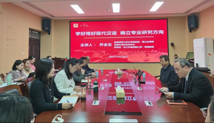 2025年10月30日上午,教育部“长江学者奖励计划”特聘教授、陕西师范大学教授乔全生莅临文学院,以《学好用好现代汉语,确立专业研究方向》为题开展学术讲座。讲座由文学院副院长张言军主持,汉语教研室部分教师及汉语言文学专业100余名本科生共同聆听。